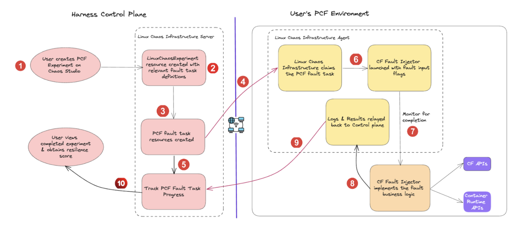 The first component is a subscriber service that runs as a native CF app (or microservice) that interacts with the Harness control plane, claims the CF fault requests, and performs one of the following: