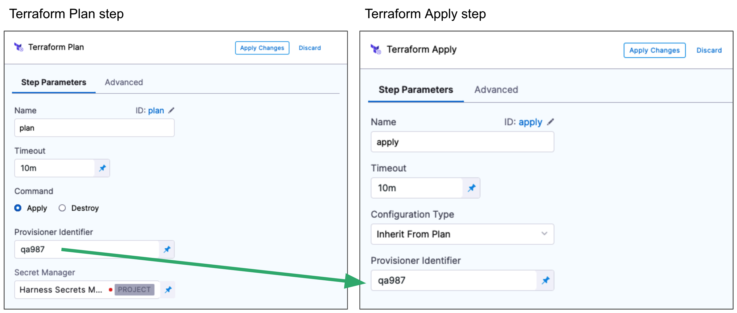 When you add Terraform Plan and Apply steps, you specify the Terraform script that Harness will use for provisioning. You add a Provisioner Identifier to each step to identify the provisioning.