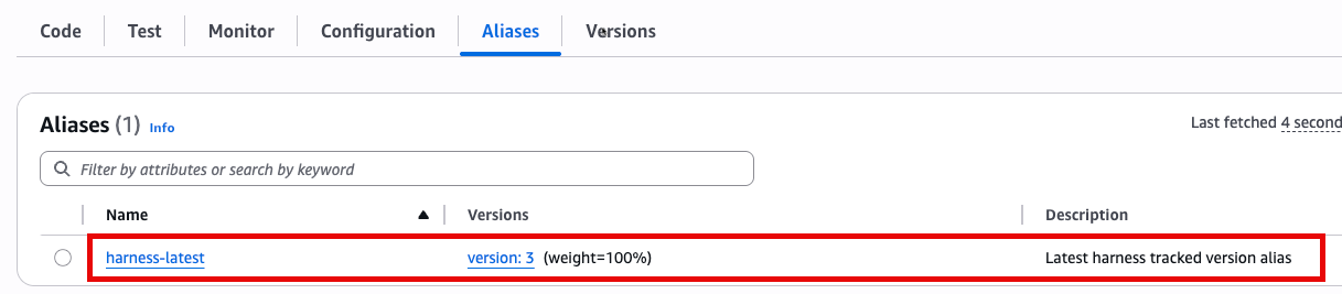 Harness uses Lambda function aliases to support rollback workflows. During deployment, Harness creates or updates an alias to point to the latest function version. If a rollback is triggered, the alias is redirected to the previously deployed version—restoring the last known good state.