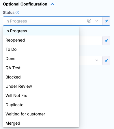 - In Status, enter the status type (Issue Action) to update the issue with (In Progress, Done, etc). Harness will automatically update the issue with this status.