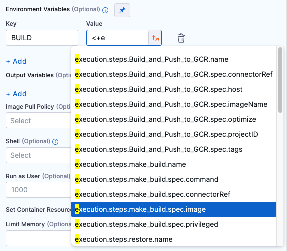 You can inject environment variables into the step container and use them in the Command script. You must input a Name and Value for each variable.