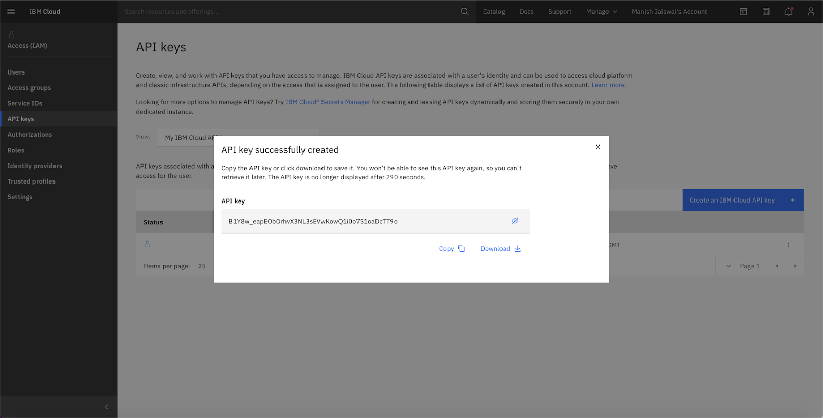 Once the API key is successfully generated, click Copy or Download the API key.