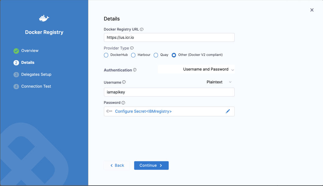 Harness uses Docker Registry Connectors at Pipeline runtime to authenticate and perform operations with IBM Cloud Registry. Authentications and operations are performed by Harness Delegates.