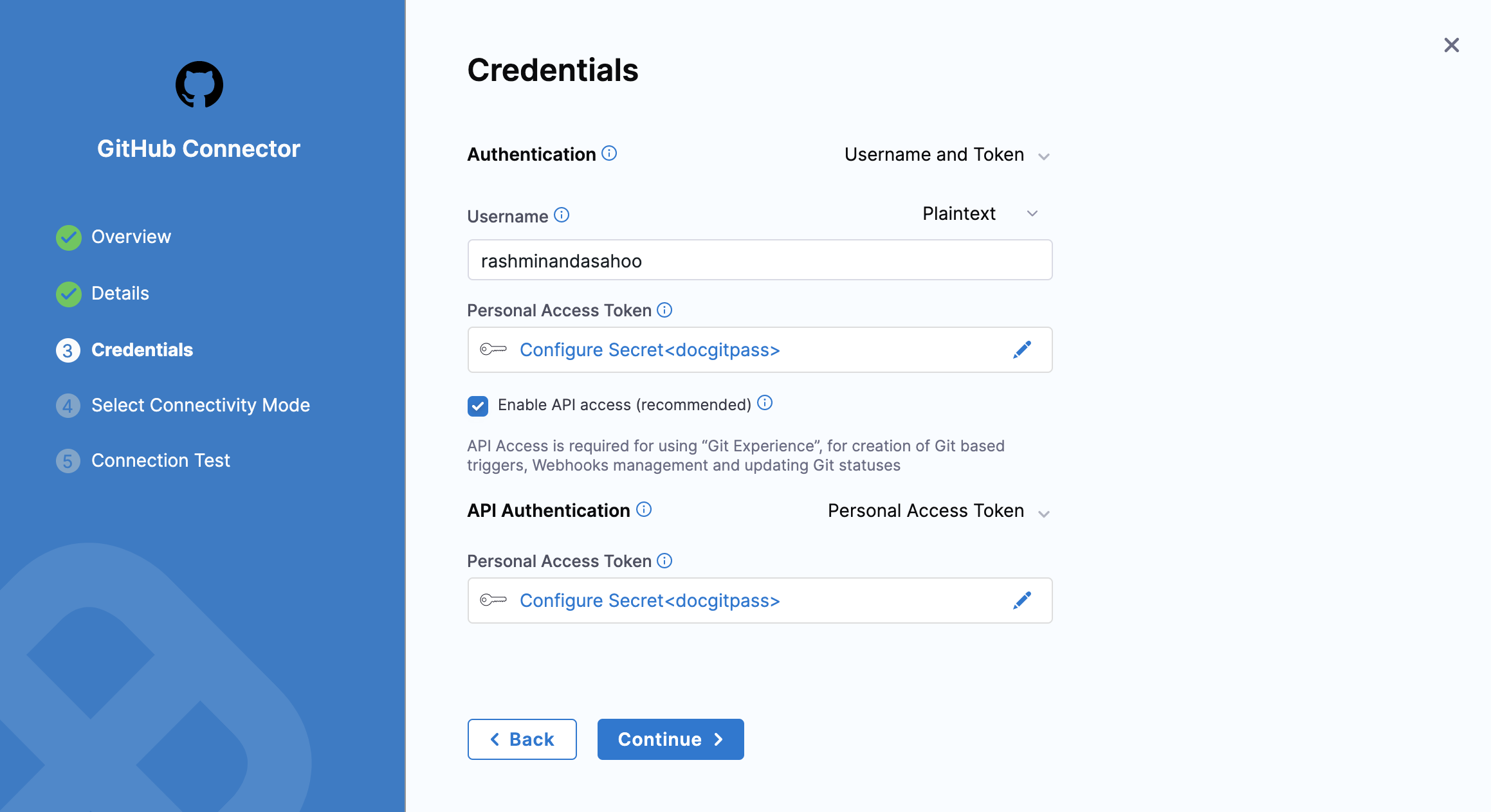 - In the Username field, enter your personal GitHub account name. You can use either plaintext or a Harness encrypted text secret.