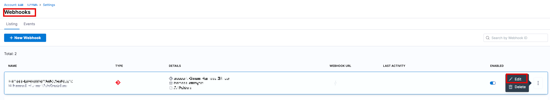 (Project/Organization/Account level) for the webhook - Locate the webhook, click on the three dots