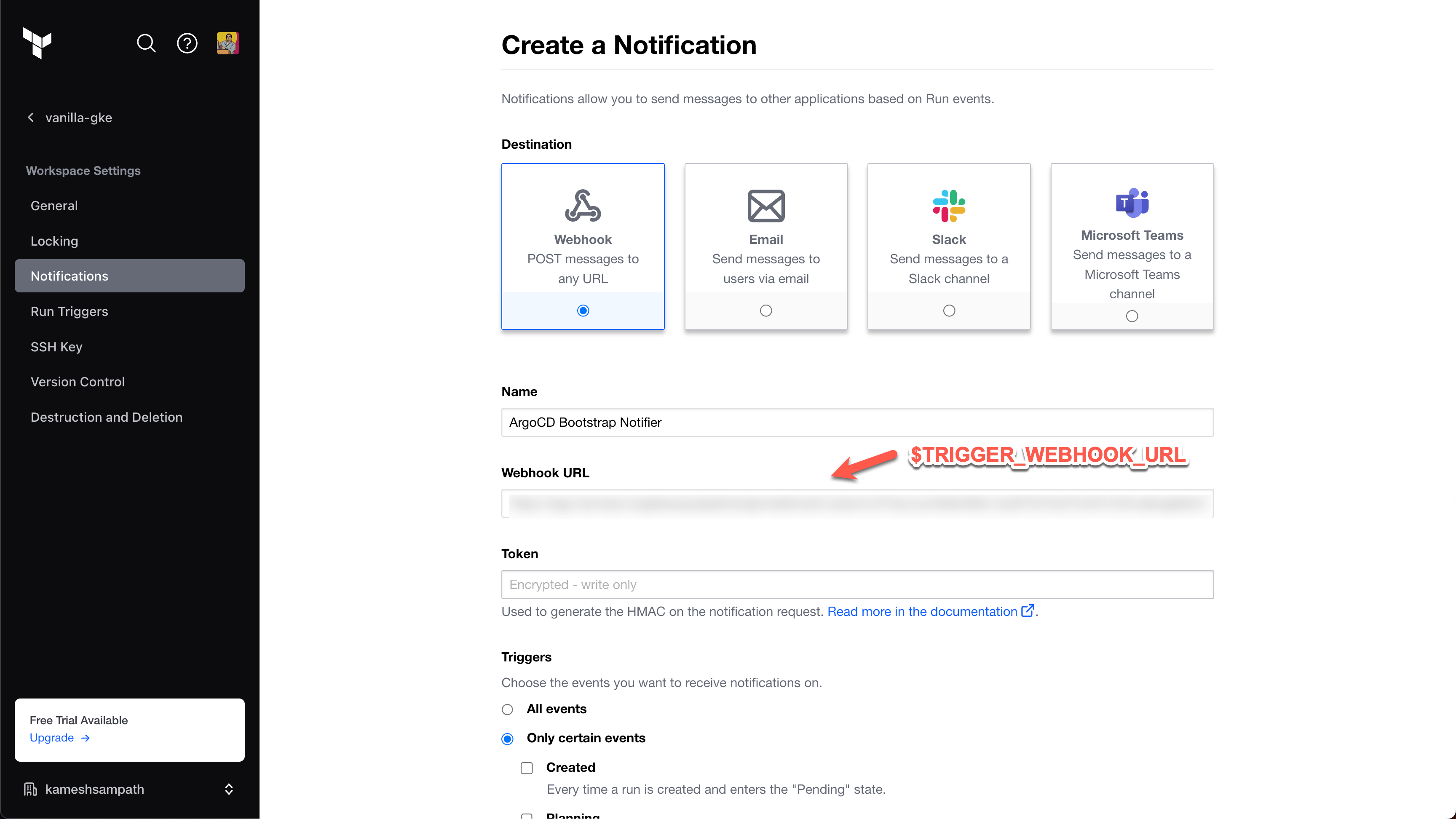 In your Terraform Cloud workspace, go to the notification settings, and select Create a Notification.