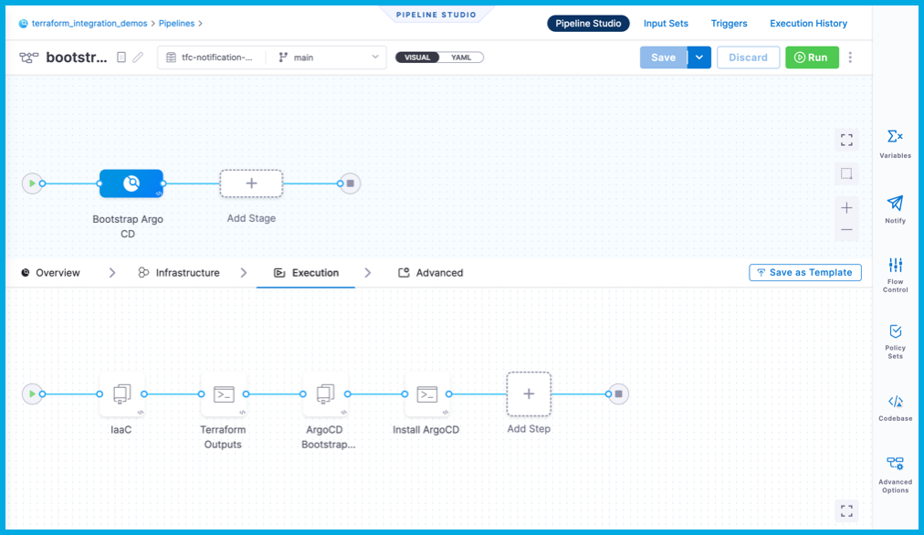 This pipeline is now configured to listen for notifications of IaC events from Terraform, and the pipeline only runs when it's necessary. Specifically in this pipeline, any changes to the $TFC_GKE_REPO
