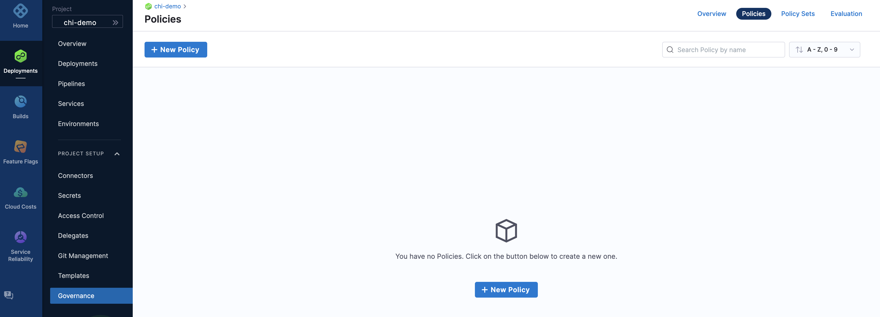 In Policy to Evaluate, select the Quickstart policy you created. Policies can be created at the Account, Org, and Project level.