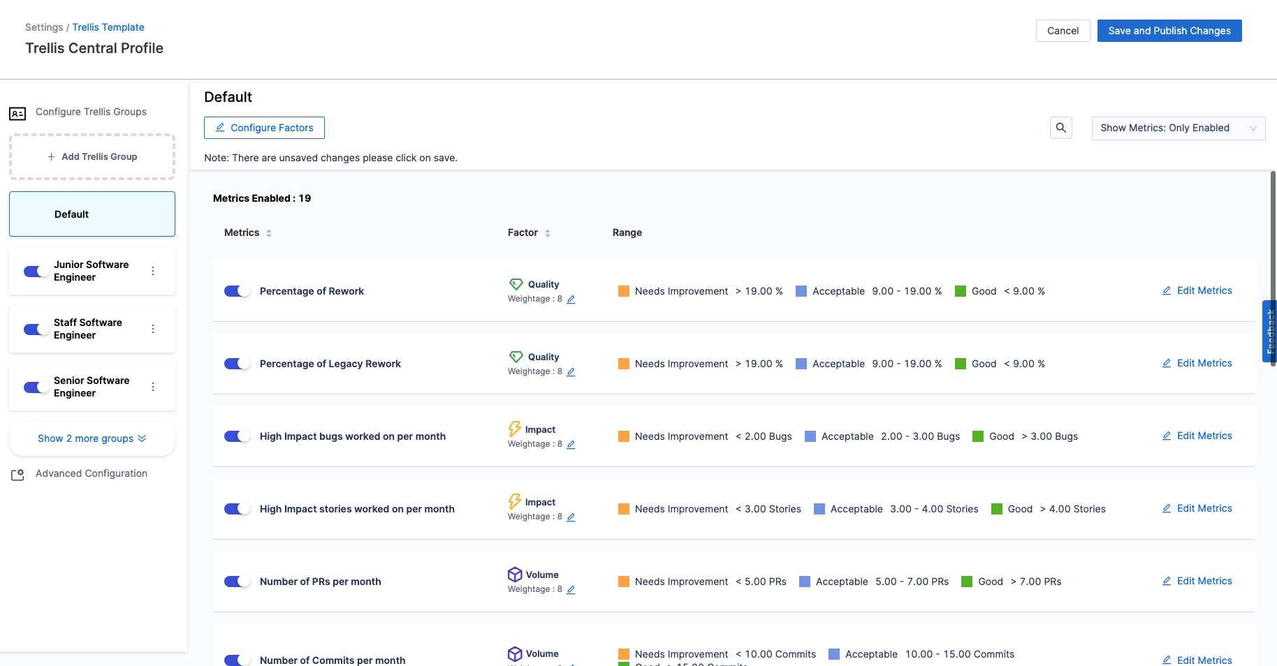 With Trellis Groups, you can fine-tune how factors like Code Quality, Volume, Speed, Impact, Proficiency, and Collaboration are evaluated. The customizations are based on the responsibilities and expectations associated with different custom attributes. For example, you could create separate calculation rules for different engineering roles.