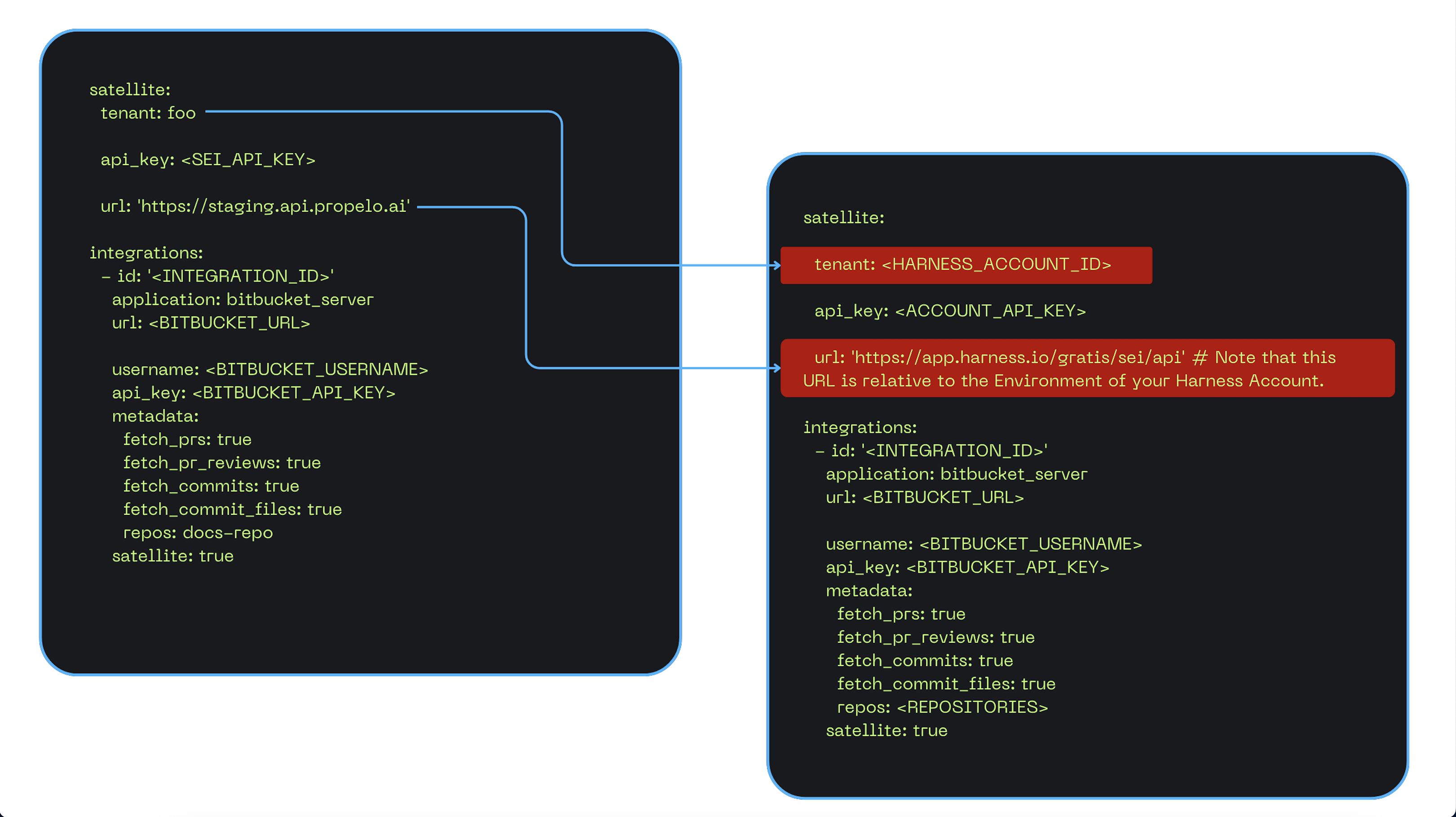 file, replace the existing Propelo Account ID in the tenant field with the new Account ID of your Harness account. You can find this ID in the Harness account URL. - Update the Base URL to match the appropriate environment: